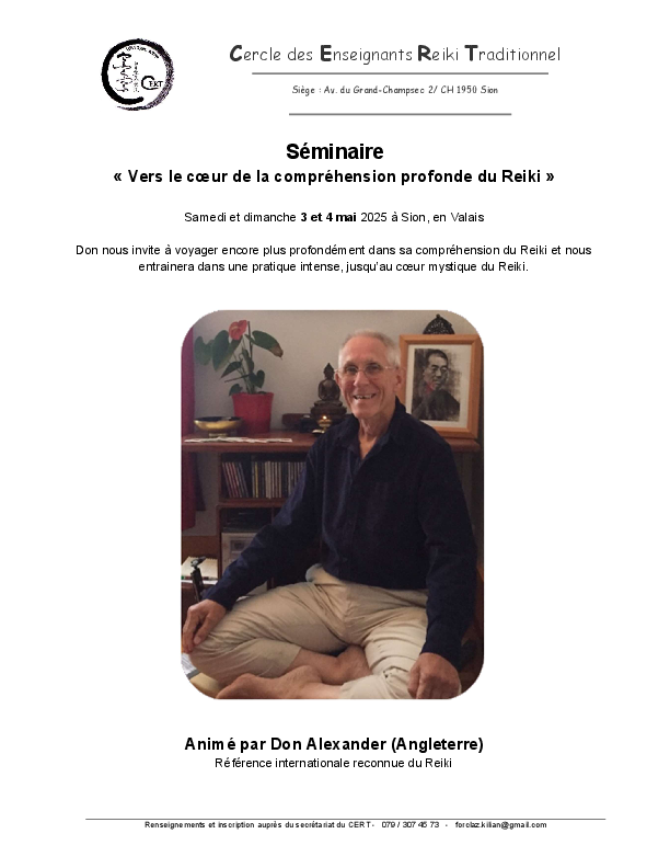 Kilian et le comité du CERT sont heureux de vous informer que Don Alexander reviendra pour un séminaire de Reiki en Valais, les 3 et 4 mai 2025, dans lequel Don nous invitera à voyager encore plus profondément dans sa compréhension du Reiki et nous entrainera dans une pratique intense, jusqu’au cœur mystique du Reiki.