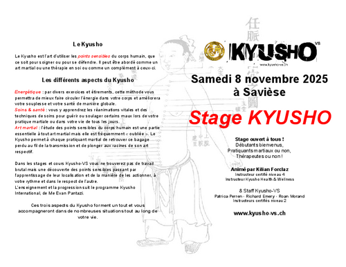 Le comité de Kyusho-VS a le plaisir de vous proposer 2 stages cette saison, le samedi 8 novembre 2025 et le samedi 6 juin 2026. Vous trouverez ici le flyer du stage du 8 novembre où l'accent sera mis sur le lien entre le Kyusho santé et le Kyusho martial. Le stage du 6 juin fera quant à lui le lien entre l'énergétique et le Kyusho martial.