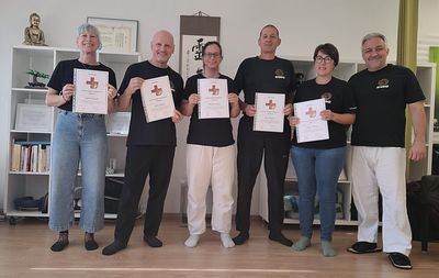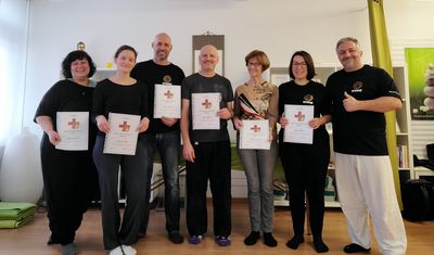 et dernier détail mais non des moindres, Kilian a pu passer son examen d'instructeur certifié niveau 4 (CI-4), ainsi que le niveau 4 d'instructeur de Kyusho Health & Wellness! Merci aux Uke de s'être porté volontaire pour cet examen: Sophie, Olivier, Patricia, Richard et Roan!